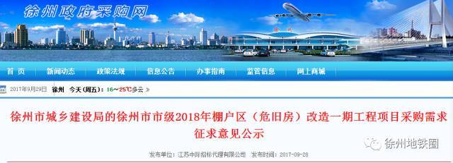 据徐州政府采购网,徐州市城乡建设局的徐州市市级2018年棚户区(危旧房)改造一期工程项目采购需求征求意见公示: